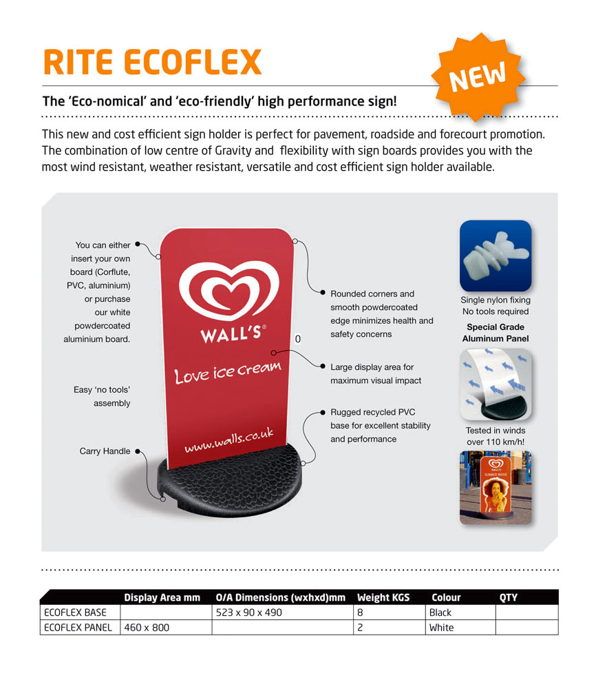 All signage, no distractions, this recycled PVC weighted base with flexible steel panel display commands attention in any pedestrian setting. It’s low centre of gravity provides excellent stability